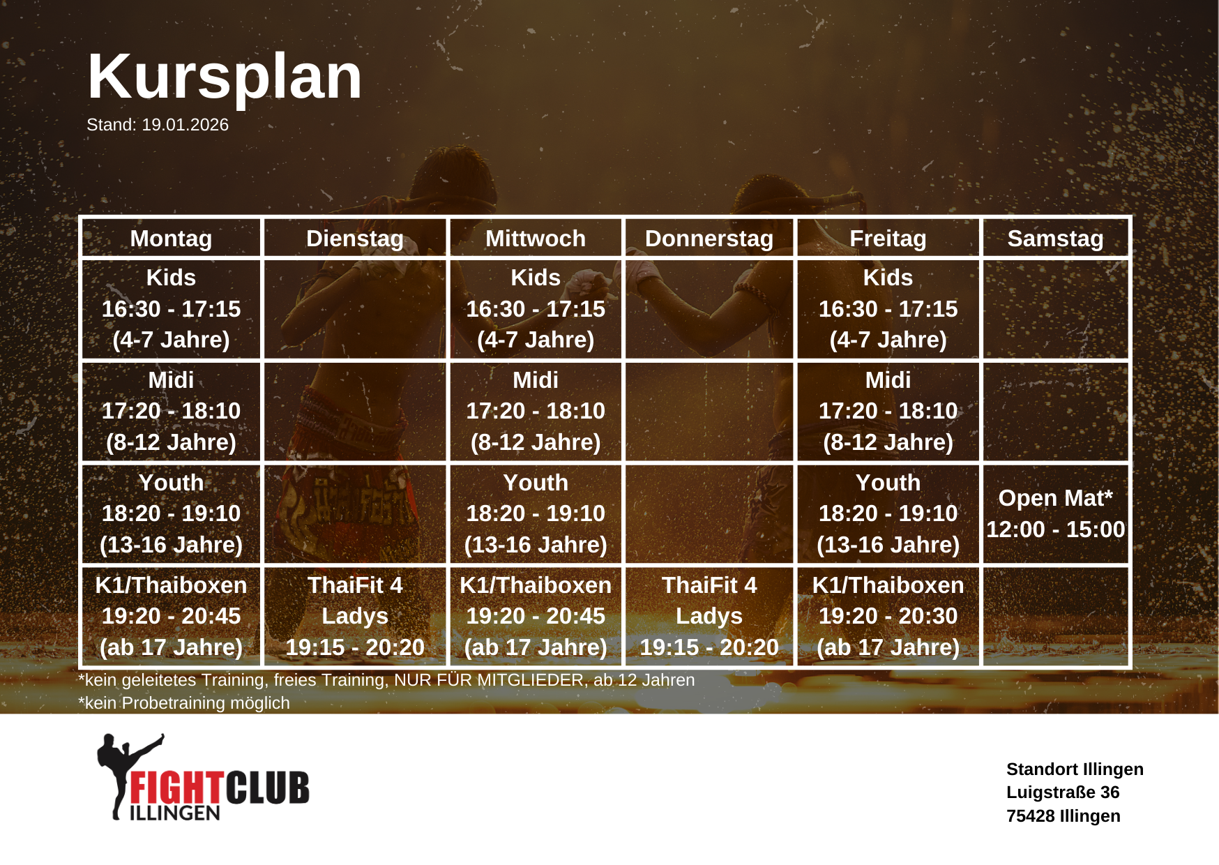 Kick/Thaiboxen · K1 · Grappling · Thai-Fit · Muai Thai · MMA · EMS Fit